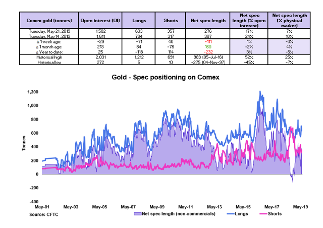 Speculators notably cut their net long position in Comex gold over May 14-21. Non-commercials reduced their net long position by 111 tonnes, which represents 3% of the gold physical market.