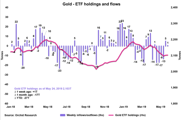 Last week, gold ETF holdings increased marginally by 1 tonne. The SPDR GLD (GLD) received nearly 3 tonnes of net inflows whereas the iShares Gold Trust (IAU) experienced a net outflow of ~1 tonne.