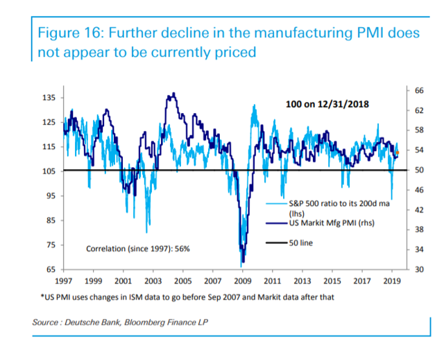 Our friends from Deutsche Bank illustrate this point in the below chart, comparing the SP500 ratio to its 200 DMA and the US manufacturing PMI.