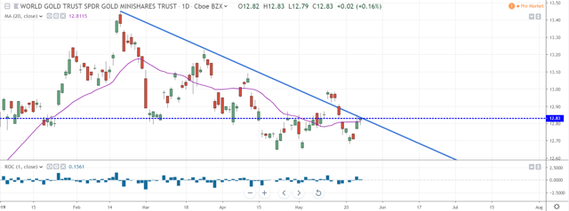 GLDM remains below its downtrend from its 2019 high of $13.45 per share.