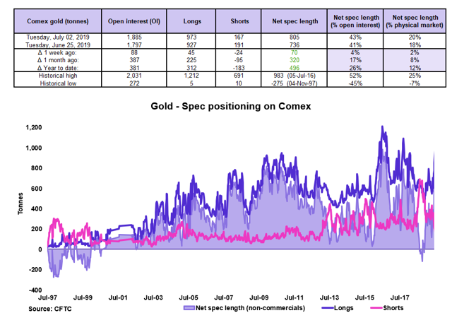 Speculators lifted their net long exposure to Comex gold for a fifth straight week over the latest reporting period of June 25-July 2.