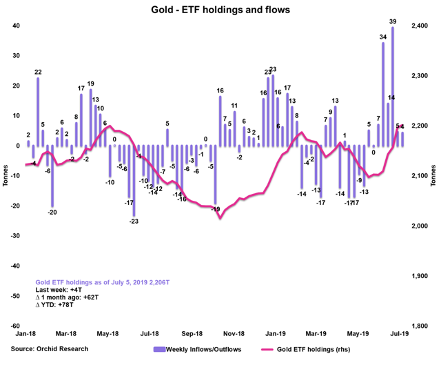 Gold net inflows totaled a modest 4 tonnes last week. This comes after a net monthly inflow of 92 tonnes in June, the largest since February 2017.