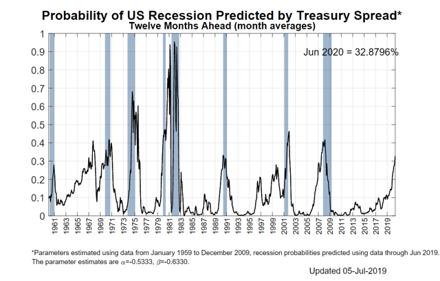 The probability of a recession in the next 12 months rose to 33% in June from 29% in May, according to the New York Fed recession model based on Treasury spreads.
