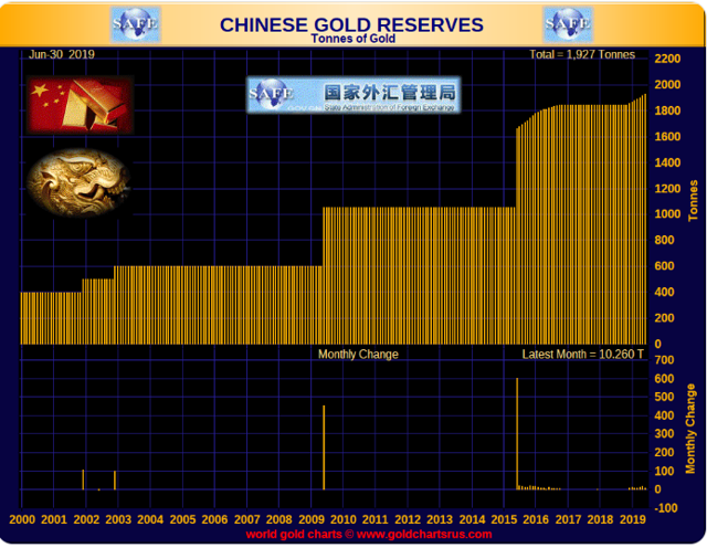 The Chinese central bank (PBOC) lifted its gold holdings by 10.3 tonnes in June, after buying 74 tonnes in the first five months of 2019.