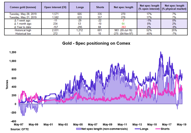 Speculators left their net long position in Comex gold broadly unchanged over May 21-28.