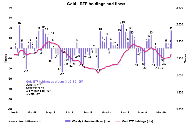 The SPDR GLD received the largest inflow on Monday June 3, by roughly 16 tons.