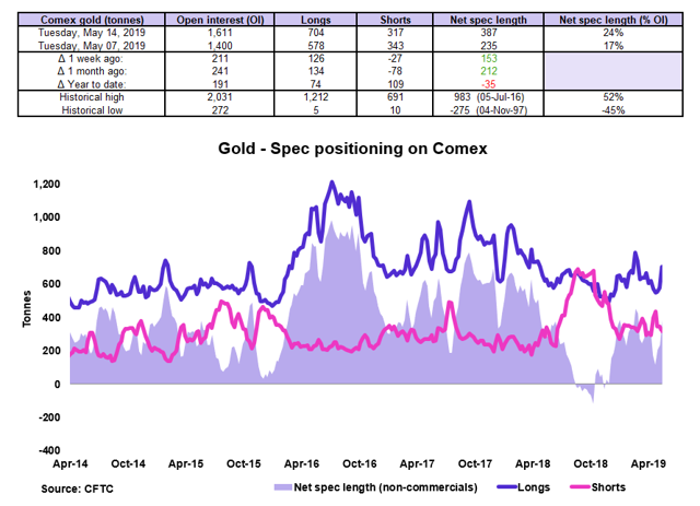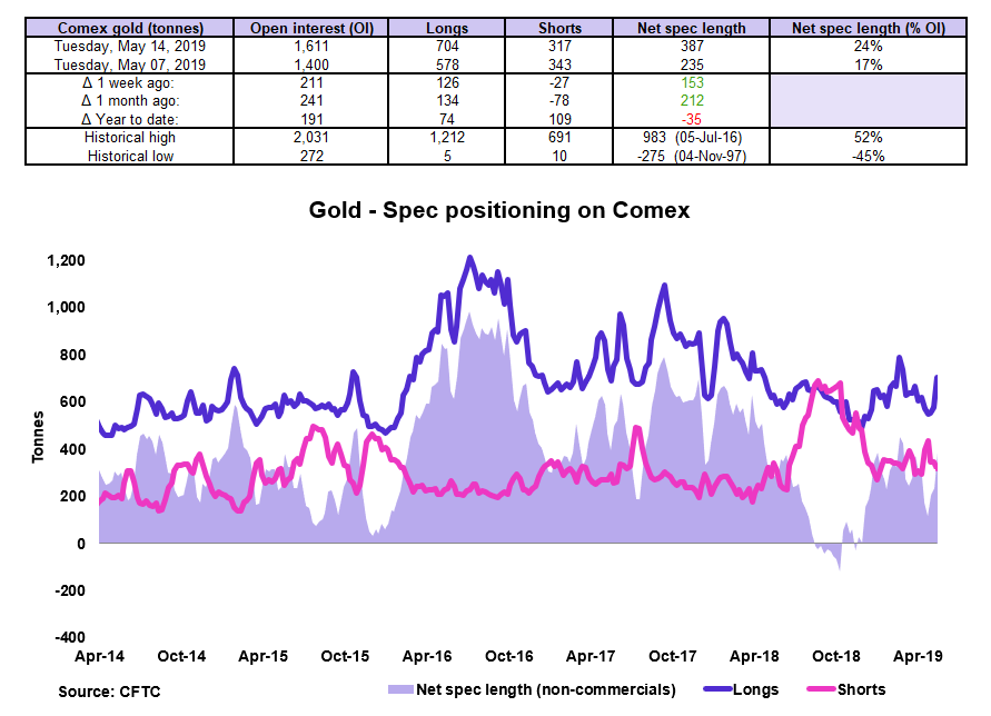 Speculators lifted markedly their net long exposure to Comex gold in the week to May 14, at the strongest pace since October 2018.