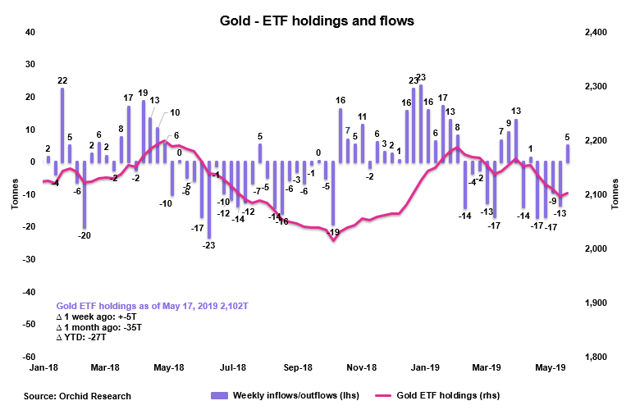 Inflows were concentrated on Monday (May 10) due to the violent sell-off in US equities (-2.4% on the day), which scared investors and prompted them to hide in gold.