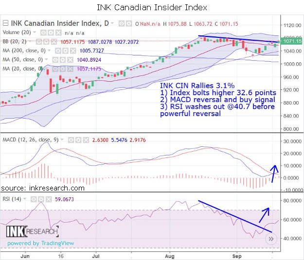 Thank you for joining us in a weekly technical look at the mid-cap oriented INK Canadian Insider (CIN) Index. Last week, the INK CIN rebounded from its retreat to 1038.55 with a nice 32.6 point bounce to 1071.15, for an impressive gain of 3.1%.