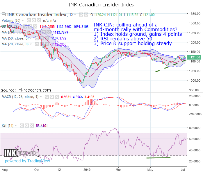 Last week, the INK Canadian Insider Index was about even with the price of Oil which had a small gain. The Index did outperform copper which showed a nominal loss. The INK CIN also beat gold and silver, down 1.5% and 1.8% respectively. The Index remains bullish as it sits above both its 50- and 200-day moving averages. I am looking for another rally in commodities to begin in the next 10 days or so (I see this recent pullback as the pause that refreshes). And if that happens, I think the INK CIN will finally rally and break free of the 1120-1125 range.