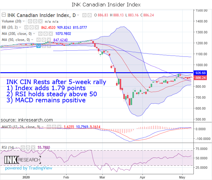 Thank you for joining us in a weekly technical look at the mid-cap oriented INK Canadian Insider (CIN) Index. Last week, the Index rose 1.79 points to close at 886.24.