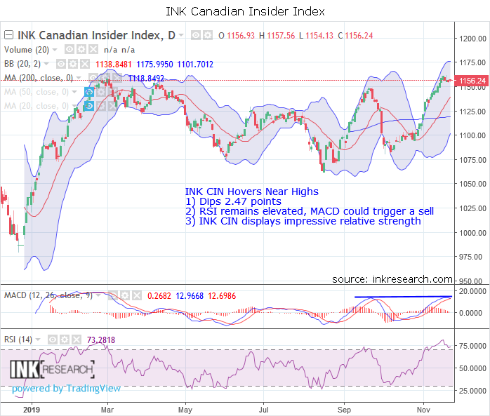 Thank you for joining us in a weekly technical look at the mid-cap oriented INK Canadian Insider (CIN) Index. The Index barreled into last week on a 3-week, 5.2% winning streak after achieving a new 52-week high. Last week, the Index went on carve out a fresh closing high at 1160.23 before pulling back to end the week at 1156.24, down 2.47 points.