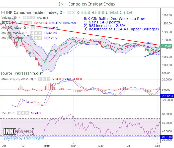 Thank you for joining us in a weekly technical look at the mid-cap oriented INK Canadian Insider (CIN) Index. Last week, the Index saw its newfound momentum snowball as it continued its rally 14.8 points or 1.3% to finish at 1113.08.
