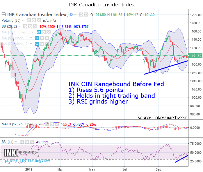 Thank you for joining us in a weekly technical look at the mid-cap oriented INK Canadian Insider (CIN) Index. The Index moved up a modest 5.6 points to finish at 1101.30 and remains locked in a tight trading range.
