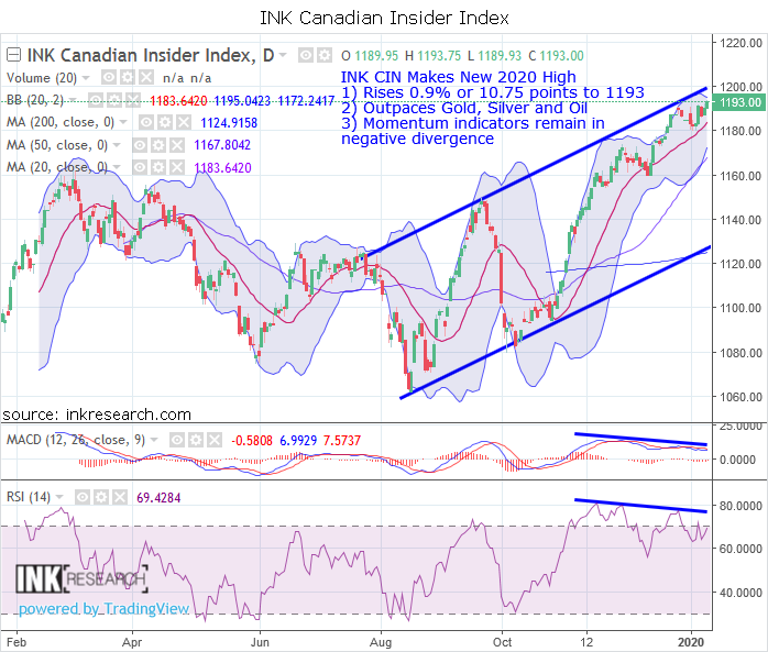 The INK Canadian Insider Index is used by the Horizons Cdn Insider Index ETF (HII). The INK CIN's move higher has been impressive but the technical caution remains, for its momentum indicators MACD and RSI show negative divergence and have not moved anywhere near their highs along with price. Given that, the big round number 1200 ought to provide a key test in early 2020.