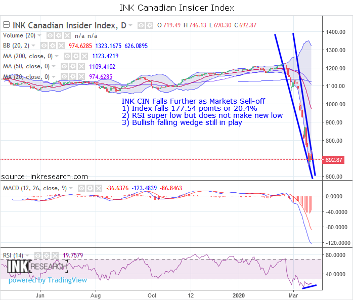 Thank you for joining us in a weekly technical look at the mid-cap oriented INK Canadian Insider (CIN) Index. Last week, the INK Canadian Insider Index continued to sell off in one of the greatest worldwide market panics of our lifetime. The INK CIN fell 177.54 points or 20.4% to an all-time low of 692.87, making for a two-week plunge of over 40%.
