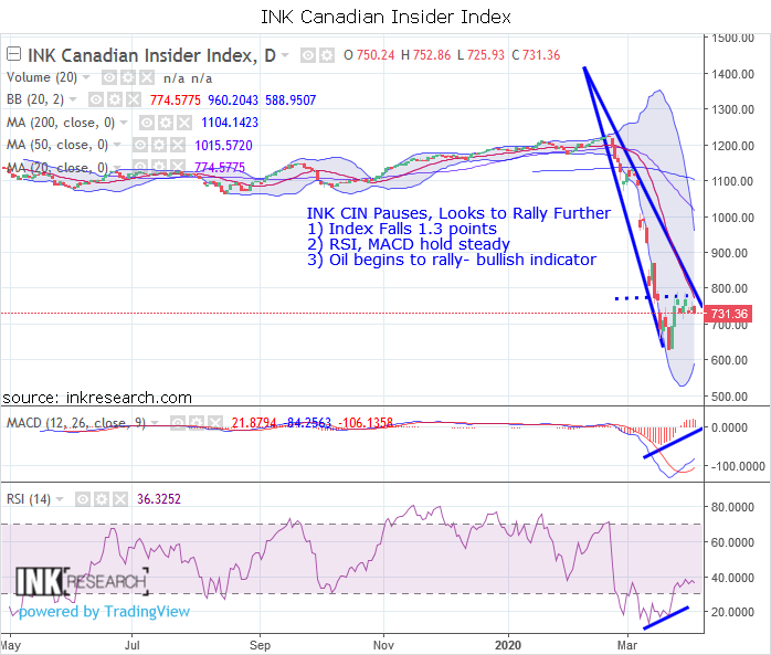 Thank you for joining us in a weekly technical look at the mid-cap oriented INK Canadian Insider (CIN) Index. The INK Canadian Insider Index bounced as much as 56 points to 788 but could not maintain its strength and retraced fully before closing at 731.36, down 1.3 points on the week.
