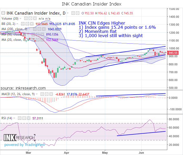 Thank you for joining us in a weekly technical look at the mid-cap oriented INK Canadian Insider (CIN) Index. Last week, the Index made a nice hop higher, hurtling as high as 967.52 intraday, before closing with a gain of 1.6%, or 15.24 points, at 945.55.