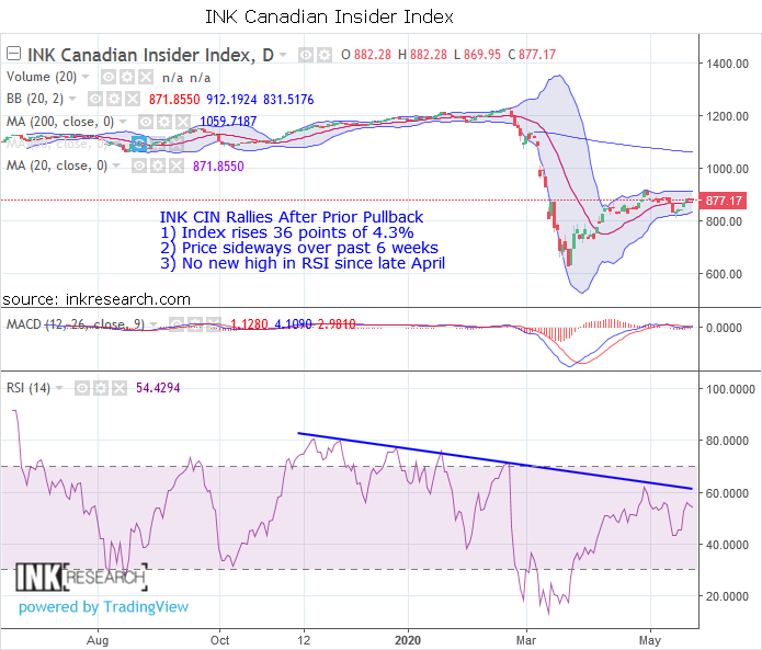 Thank you for joining us in a weekly technical look at the mid-cap oriented INK Canadian Insider (CIN) Index. Last week, the INK CIN added 36.03 points or 4.3% to close at 877.17.