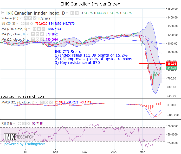 Thank you for joining us in a weekly technical look at the mid-cap oriented INK Canadian Insider (CIN) Index. Last week, the INK Canadian Insider Index surged an impressive 111.89 points or 15.2% to close at 843.25. With last week's gain, the Index has rebounded 38.5% off its March lows.
