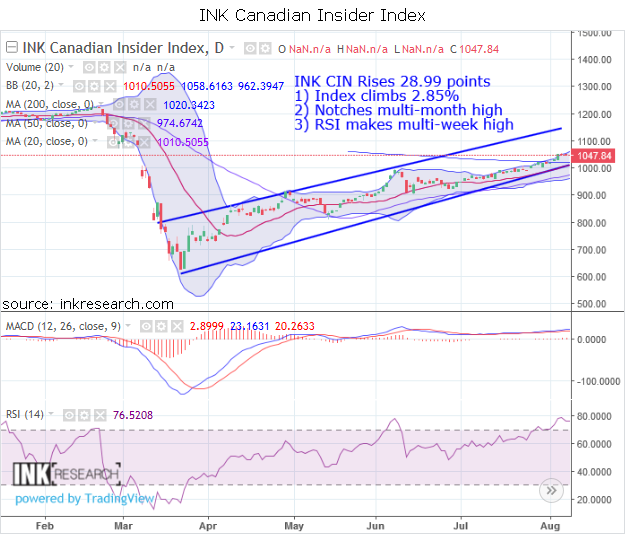 Thank you for joining us in a weekly technical look at the mid-cap oriented INK Canadian Insider (CIN) Index. Last week, the Index pushed up even higher as metals and markets pushed higher yet.