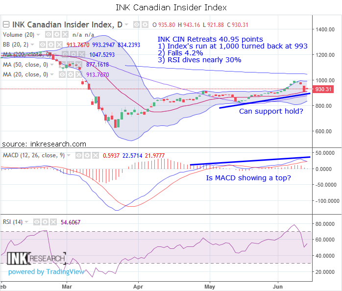 Thank you for joining us in a weekly technical look at the mid-cap oriented INK Canadian Insider (CIN) Index. Last week, the INK CIN took a spirited run at the 1,000 level but ran into heavy resistance at 992-993. Ultimately, it was then yanked downward along with correcting US markets and fell 40.95 points to close at 930.31 for a loss of 4.2%.