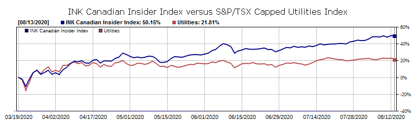 The Top 40 stock list is generated based on INK Edge V.I.P. outlook rankings as of August 13, 2020. The Horizons Cdn Insider Index ETF (HII) uses the INK Canadian Insider Index under license with INK Research.