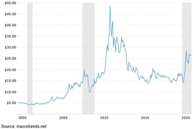 Let's now move to the current silver bull market that I believe began in 2001. The following chart shows us silver prices since 2000, not adjusted for inflation.