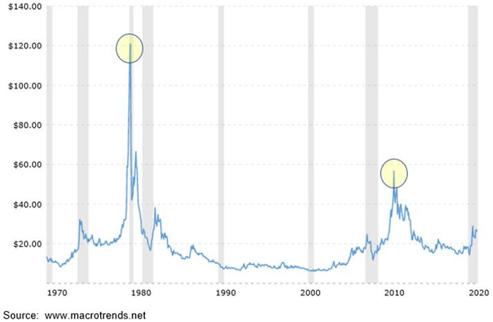 If we consider inflation-adjusted silver prices going back to 1970, we see that the peak reached in 1980 was actually $120/ounce in today's dollars, and that's using government sanctioned inflation statistics, which tend to be well below what we experience in everyday life.