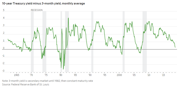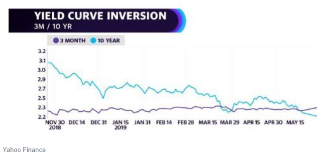 Another source of fear is the relationship between the Ten-year T-note yield and the 3-month T-Bill yield known as the "yield curve." When Ten-year yields sink below 3-month yields, the yield curve becomes "inverted." (See chart above.) Yesterday's 2.076% Ten-year Treasury yield was 25 basis points (1/4 of 1 percent) lower than Friday's 2.33% 3-month T-Bill yield. This makes the curve the most inverted it has been in a long time.