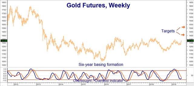 Gold has formed a six-year base and is rallying from severely oversold levels on both a daily and weekly basis. As we mentioned earlier, the swing high of $1,350 per ounce is a key level short term. A few closes over $1,350 would set the stage for an assault of the August 2013 high of $1,434 per ounce. Take this out, and our second $1,500 per ounce target comes into play.