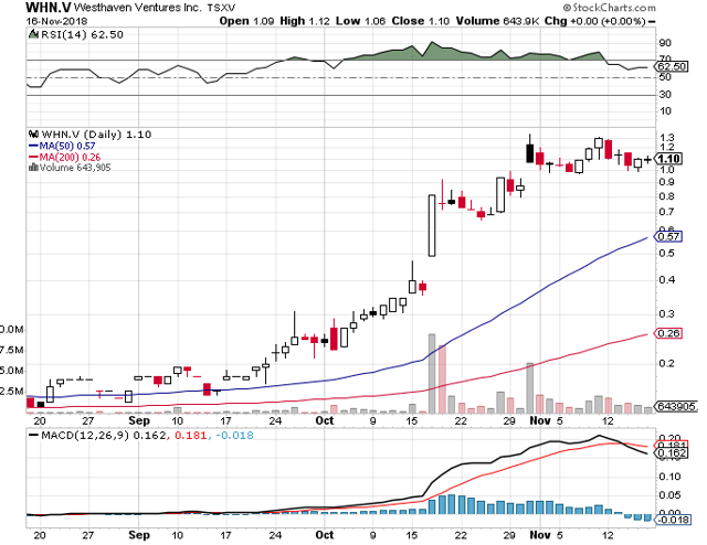 The gold discovery success stories continued in the summer and fall of 2018. Westhaven Ventures (OTC:WTHVF) announced a high-grade gold discovery at its Shovelnose property in British Columbia with a series of drill results in October 2018. The market responded enthusiastically: