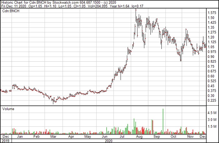 The second company we wrote about was Benchmark Metals TSX-V:BNCH. Benchmark had a very active summer drill program of 100,000 meters east of the Golden Triangle and that was one of the reasons we started to follow this play. At the early start the stock price was still in the 30 cent range and as summer progressed and news was released the stock climbed to a high of $1.60 giving early investors a healthy 500% gain. The stock has settle back with a 30% retracement and is now in trading sideways in the $1-1.20 range.