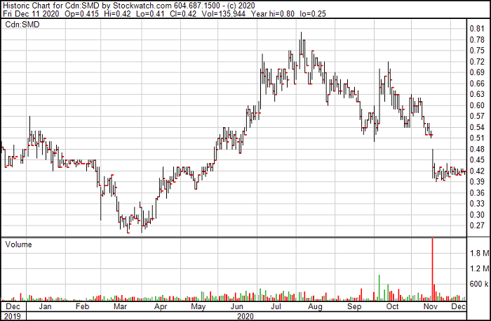Not all of the juniors we followed did well. In early spring we took a look at Strategic Metals Ltd TSX-V:SMD. At that time the stock was in the 30 cent range and the company was talking about their up coming summer drill program at Mt Hinton in the Keno mining district of Yukon. The stock climb all summer and things looked promising but by mid November when news was finally issued about assays and after gold prices had slumped into fall, the stock took a hit. This is the perfect example of how thing can go wrong when maybe drill results are not up to market expectations.