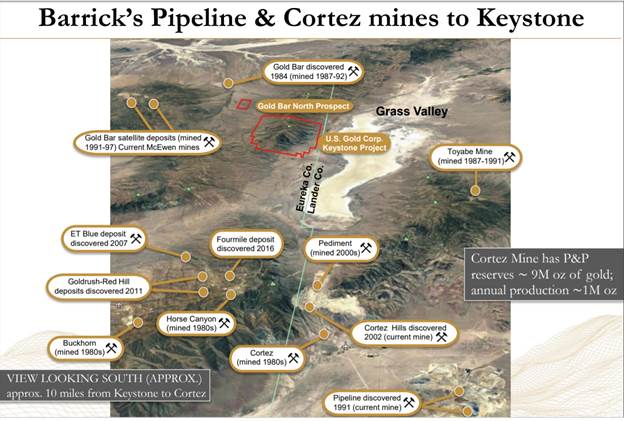 Edward Karr: We had an opportunity come along while were still private and only had our flagship project Copper King. In 2016, I received a telephone call from Dave Mathewson, the well-known Nevada exploration geologist, and he had a new exploration project called Keystone. Dave told me that he believes Keystone is the best exploration project he has seen in his career. It has an incredible address being located in Nevada on the Cortez Gold Trend. It's about 12 miles south of Barrick Gold's Cortez Hills complex, which includes the Cortez Hills Mine, the new discoveries, Gold Rush, ET Blue and Fourmile. We are right below that and it looks very prospective. When Dave told me about it, I just knew we had to do a deal, so we acquired Keystone into U.S. Gold Corp.