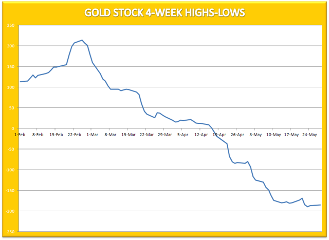 Meanwhile, the internal profile for the 50 most actively traded gold stocks remains weak. Shown here is the 4-week rate of change (momentum) of the new highs and new lows in the 50 most actively traded gold stocks. As you can see here, the trend of this indicator remains down. I use the new highs and lows to gauge the overall demand for equities, and with the demand for gold stocks evidently in decline, the path of least resistance for gold stocks in the near term is still down. Until this indicator reverses its decline, investors should avoid new commitments to the gold stocks for now.