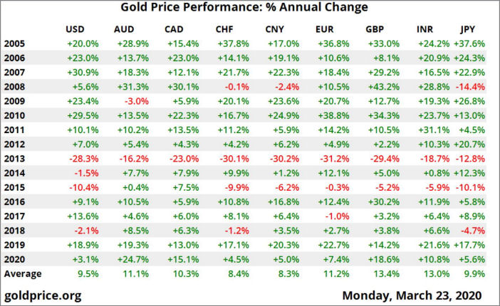 Now I know there are lots of people out there who will not buy any gold do to the fact that it doesn't give them any return on investment and they are partially correct. Yes gold does not pay out a monthly or quarterly dividend, but it does over the long term hold it's value and keeps up well even with inflation. When you consider now that the bank rates are almost zero per cent and your famous GIC or savings rates are going to be virtually zero from now on, gold does pay out very well in the end as you can see by the chart below. In fact in most currencies world wide that return has been 10% annum for the past 15 years.