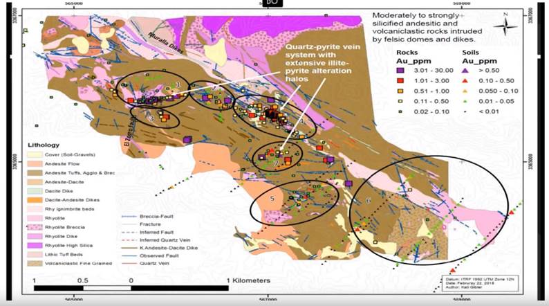 John-Mark Staude: The thing about Los Cuarenta that excites us is the location. It's near other deposits and also has really great geology. Taking a closer look at the geology, we have seven different areas of mineralization along a trend that is over four kilometers. The veins shown here are similar to the veins and mineralization we see at the Mercedes Mine that's operated by Premier Gold, and also similar to the over half a billion dollar value, very exciting project that's only 30 kilometers away, Las Chispas that's operated by SilverCrest Metals.