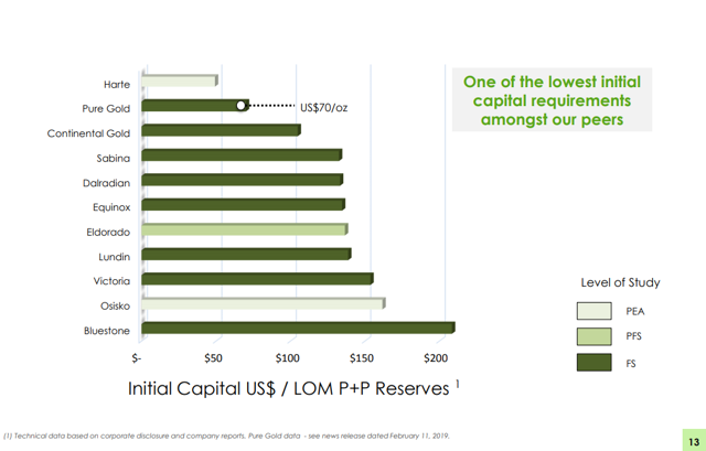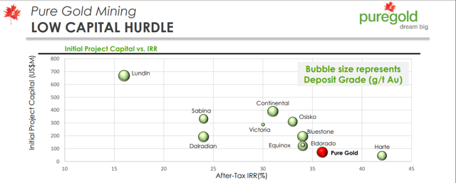 As we can see from the above table, Pure Gold is one of the only companies with capital expenditures below $100 million other than Harte Gold (OTCPK:HRTFF) and, due to this, has one of the most attractive after-tax internal rates of returns (IRR) among their peers at 36%. This suggests a payback period of just over three years. This is significant as even though an attractive IRR is essential, a low capex is also a huge benefit, given the market that we are dealing with. It is much easier for a junior miner to raise $70 million than it is for a company to raise $300+ million US like Continental Gold (OTCQX:CGOOF) and Sabina Gold & Silver (OTCQX:SGSVF). This is not to say that the latter two companies cannot raise capital to build out their mines, but in a gold market where financiers are much less enthusiastic than they were in 2010 and 2011, it helps to be on the lower side of the capex scale if one hopes to enter production without significant dilution.