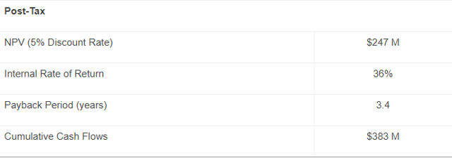 In other positive news, the company also released a preliminary economic assessment (PEA) for its Fork, Russet South, and Wedge deposits, that displays how discoveries can beef up the mine life. The PEA envisions production of an extra 210,000 ounces at an average grade of 6.4 grams per tonne gold. The projected all-in sustaining cash costs are lower than the feasibility study costs at $712/oz, given the near-surface nature of these ounces. It is still early in the exploration stage for these smaller satellite deposits, but so far, the results are encouraging. While modest, the after-tax NPV at a 5% discount is $38.2 M, with initial capex required of just under $43 million.