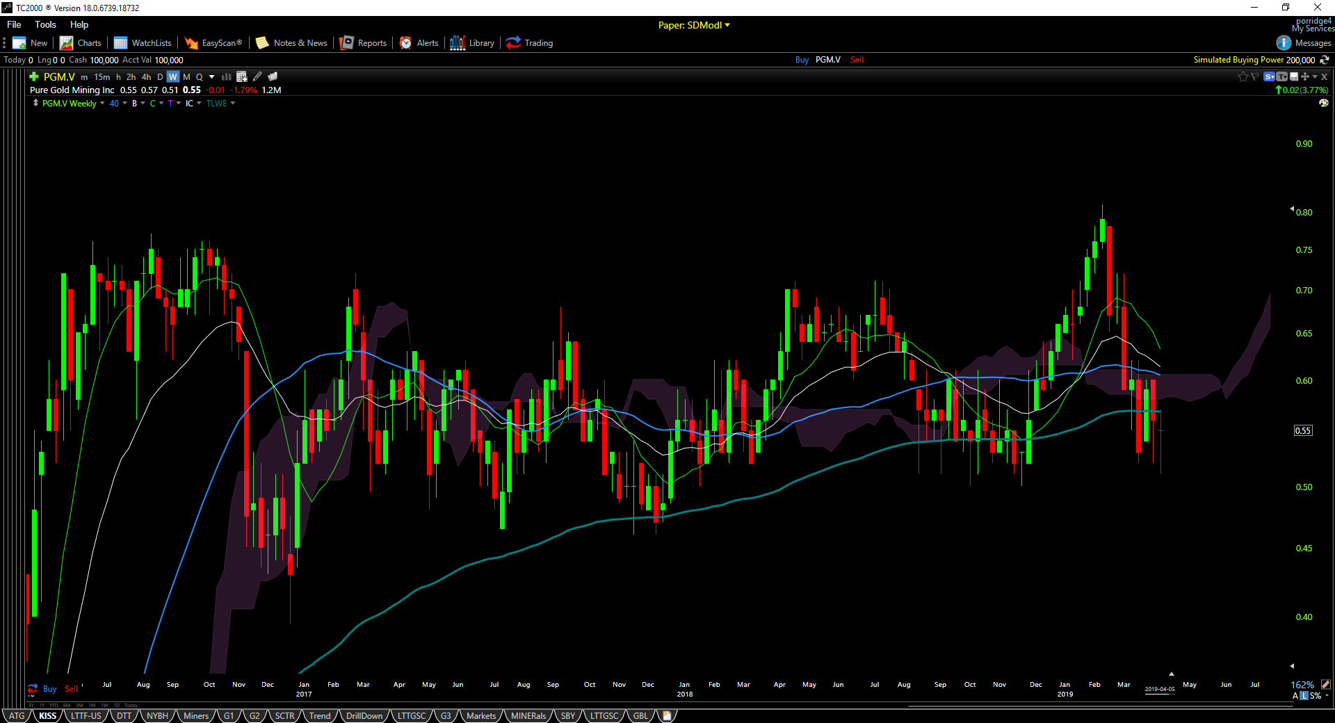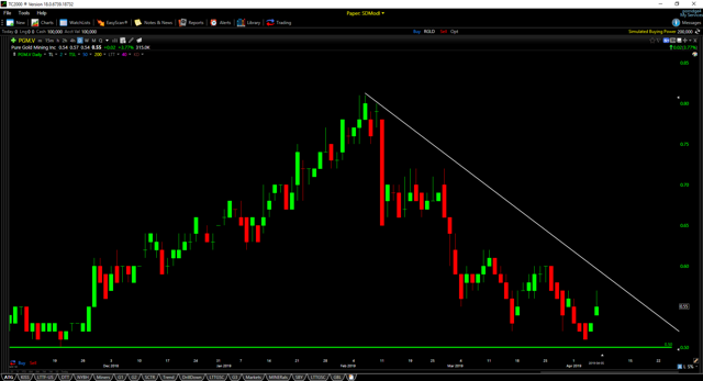 In Q4 2018, while many mining stocks were beginning to try and form bottoming patterns, Pure Gold Mining (OTCPK:LRTNF) was one of the first names to turn higher and put in 52-week highs in January. Since that time, the stock has seen its relative strength deteriorate significantly against its peers, down 14% in Q1 vs. the 5% return for the Gold Juniors Index (GDXJ). While this divergence is undoubtedly frustrating for shareholders after an impressive Feasibility Study, I believe this drop was more of a sell on news effect vs. dissatisfaction with the report itself. The stock will need to put in a weekly close above $0.64 to exit its current intermediate downtrend but is now near testing support at the bottom of its multi-year base. For more speculative investors, the stock might be worth watching for signs of a turnaround.