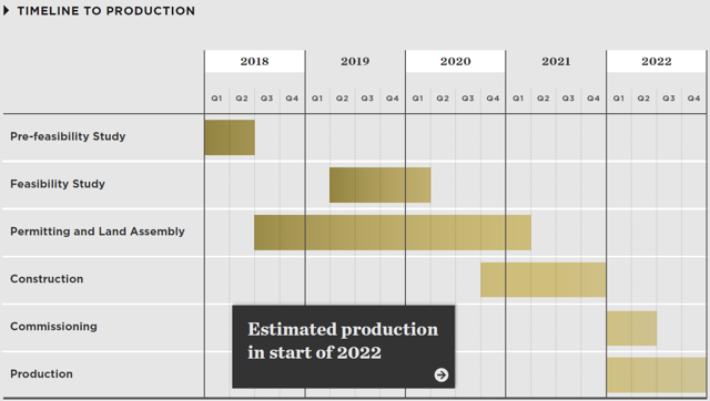 Q3 2019 PFS & Permitting. Q4 2019 Engineering, design, geotechnical. 2020 Earthworks & Construction. 2021 Production.Please note that this schedule could suffer delays and/or financing problems.