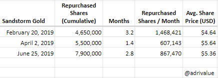 Sandstorm has repurchased approximately 7.9 million shares, or 43% of the original program of 18.3 million. The buyback program was announced on November 15, 2018.