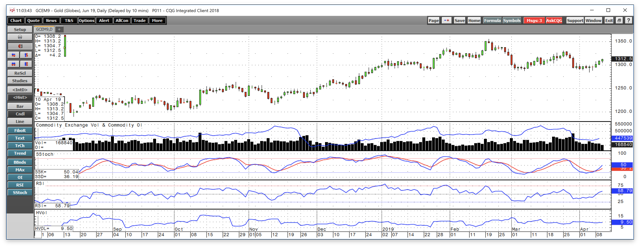 The daily chart illustrates that both price momentum and relative strength indices moved to oversold territory during the most recent corrective move to the downside. Moreover, open interest, which is the total number of open long and short positions in the COMEX futures market, declined from 524,865 contracts on March 25 when June gold was at the $1330 level to a low at 435,913 on April 5, a drop of 16.9%. The decrease in the open interest metric as the price of gold was correcting lower was not a technical validation of an emerging bearish trend in the gold market which was a sign that a bottom was in the cards sooner, rather than later.