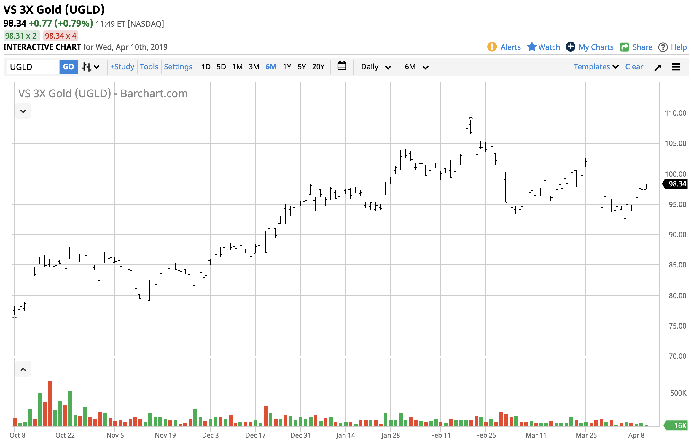 Over the same period, UGLD moved from $92.30 to $98.12 or 6.3% more than twice the move in gold on a percentage basis. UGLD is a liquid trading instrument with net assets of $113.47 million and an average of 84,890 shares changing hands each day. However, leveraged tools like UGLD suffer from time decay which eats away at their values when the price is stable or falling. Therefore, gold needs to keep pushing higher for UGLD to appreciate.