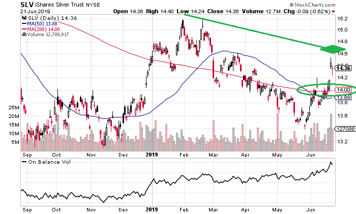 I have traded in and out of SLV several times the last year, opening a new stake on Friday for two reasons. First, the On Balance Volume (OBV) line is acting much better since December. This indicator of volume selling/buying pressure is already trading at a two-year high the last week, highlighted with the orange line on the graph above. Second, the June move higher in silver is turning the 200-day moving average UP for the first time in years. You can review on the chart below the green circle around the important 200-day MA reversal taking place.