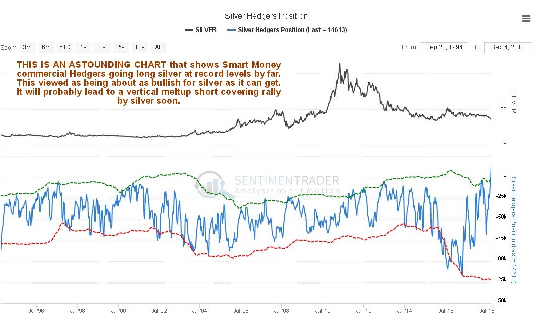 Similar to the modern record bearish sentiment in the positioning of silver futures speculators vs. commercial hedgers in August-September 2018, the bottom price a few weeks ago may prove the low water mark for quite some time. Commercials usually cut short positioning and turn bullish when few other investors are willing take the long side. They have only been net long in the futures market during parts of 2018-19 the last three decades! Focusing on the modern record "long" positioning of commercial hedgers in silver last summer, a bet on smart money longs in silver vs. the speculative money short sellers has proven a good trade idea historically. You can review below the unprecedented net long holdings of commercial hedgers last summer represented by the blue line.