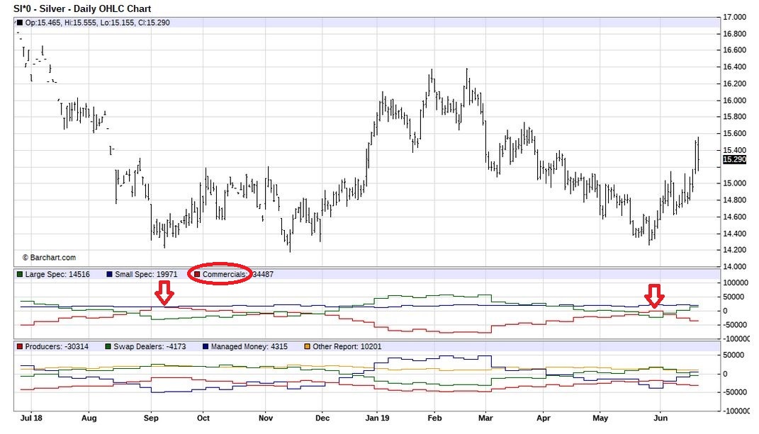 May's near record long positioning by commercial hedgers is again signaling a great intermediate-term entry point for new silver purchases, in my opinion. I am highlighting the similarities to 2018's important silver market bottom in the graph below with red arrows.