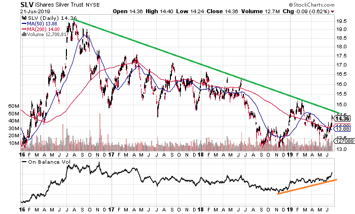 On the chart below you can review the trendline in green tested several times since 2016, forming overhead resistance for bulls. If SLV (silver) gets any type of bid the next month and can muscle above $14.75 into early July (falling to $14.60 by August), a sea change from declining long-term pricing to rising quotes may be at hand.