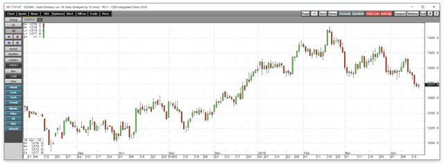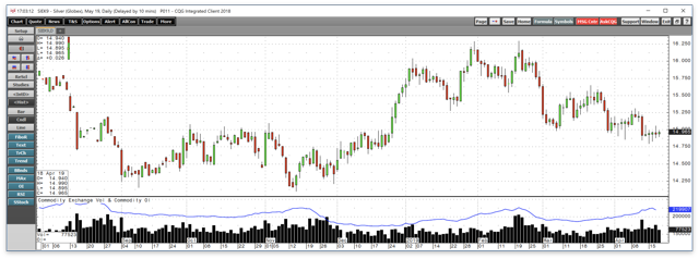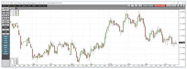 The chart of May COMEX silver futures shows that silver fell to a low at $14.845 on April 11 and put in a lower low on April 15 at $14.795 before closing last week at $14.955 per ounce. Both gold and silver are now down in 2019 compared to their closing prices at the end of 2018.